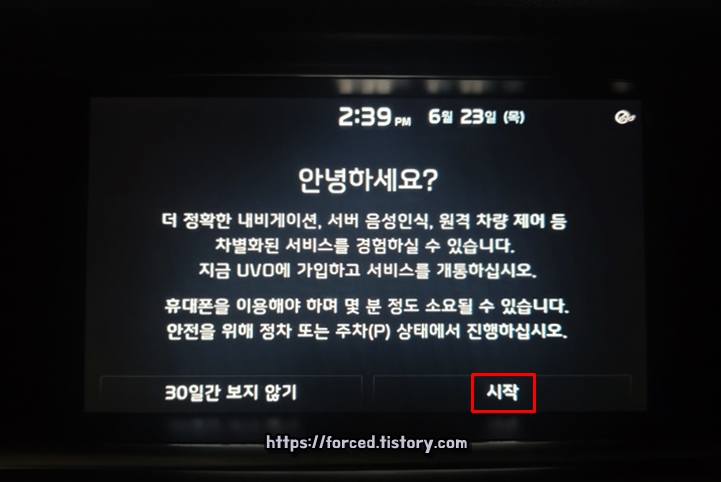 기아커넥트 UVO 앱 등록을 했다면, 이제 차량 내비 설정을 해줄 차례입니다. 기아커넥트 가입 완료 후, 차량 내비를 켜면 이러한 안내문이 나올 텐데요. 여기서 '시작'을 눌러줍니다.