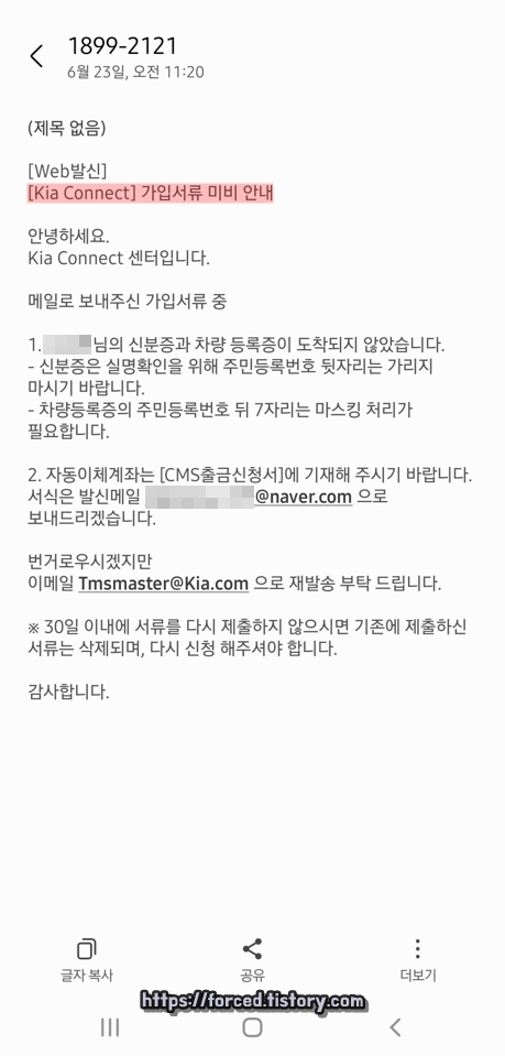 가입 신청서(회사 제출용 2장)를 모두 작성했다면, 휴대폰으로 사진을 찍어 이메일로 발송해줍니다. 기아 커넥트 가입 서류 제출 이메일은 'TmsMaster@kia.com'입니다.