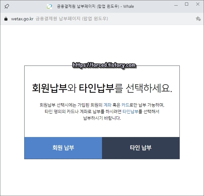 그러면 이렇게 세금 납부 창이 뜨는데요. 여기서 회원 납부를 할지 타인 납부를 할지 선택해줍니다.