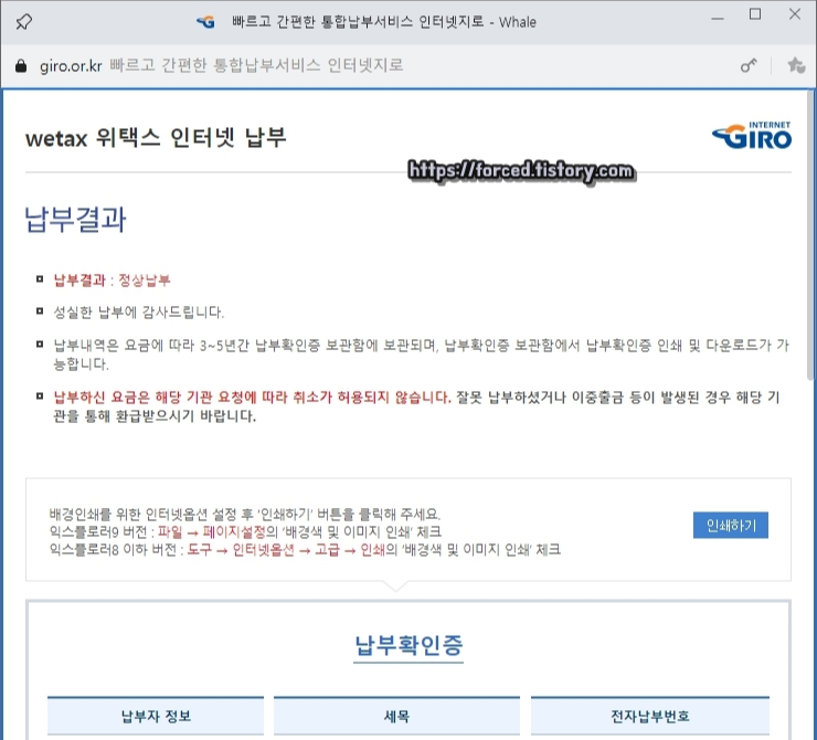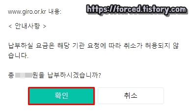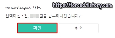 세금 납부 확인 창이 뜨면 '확인'을 눌러줍니다.