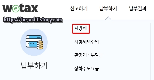 로그인 후, 납부하기 메뉴에 있는 '지방세'를 눌러줍니다.