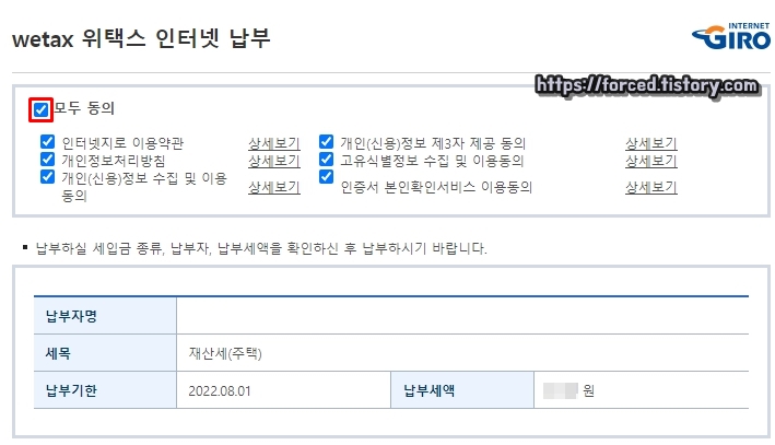 인터넷 지로 이용약관에 동의한 후, 아래에 보이는 '납부 세금 정보'를 확인해줍니다.