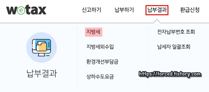 위택스 홈페이지 접속 후, 로그인하고 납부 결과 메뉴에 있는 '지방세'를 눌러줍니다.