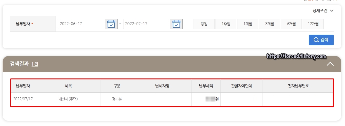 그러면 이렇게 납부 완료한 재산세를 확인할 수 있습니다. 여기서 재산세 납부일자부터 납부세액까지 모두 확인 가능합니다.