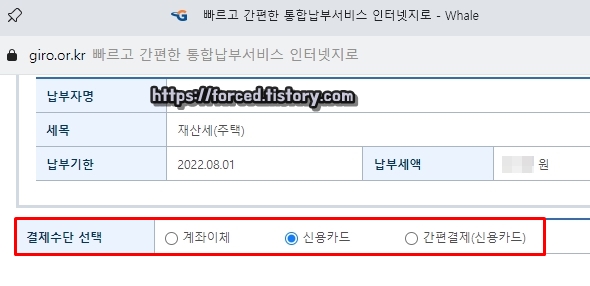 이어서 세금 결제 수단을 선택해줍니다. 선택 가능한 결제 수단은 계좌이체, 신용카드, 간편결제입니다.