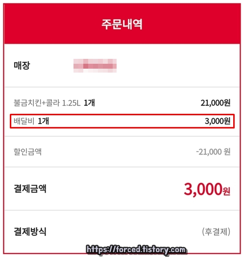 마지막으로 배달비를 확인한 후, 결제 방법을 선택해줍니다. 배달비는 신용카드 또는 현금으로만 결제 가능하며, 음식 수령 시 후불로 결제하는 것입니다. (포장 주문 시에는 배달비 없음)