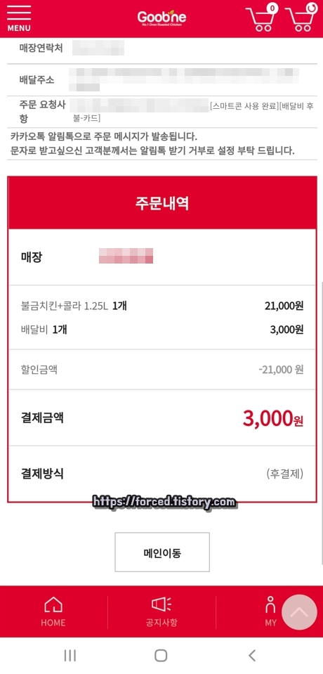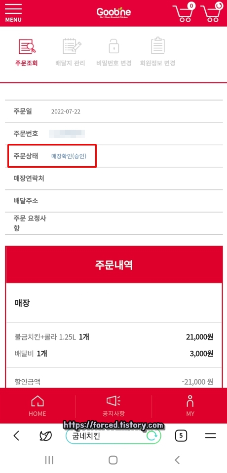 ※ 주문 내역 및 상태 확인은 "굽네치킨 홈페이지 > 좌측 상단 메뉴 > 마이페이지 메뉴"를 통해 확인 가능합니다.
