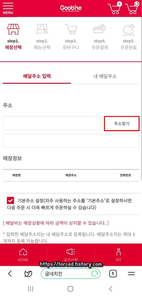 먼저 배달 주소 입력을 위해 우측에 보이는 '주소찾기'를 눌러줍니다.