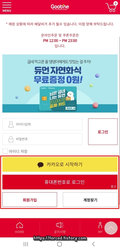 이어서 로그인을 해줍니다. 로그인은 굽네치킨 홈페이지 아이디 또는 카카오톡 아이디를 통해 가능합니다.
