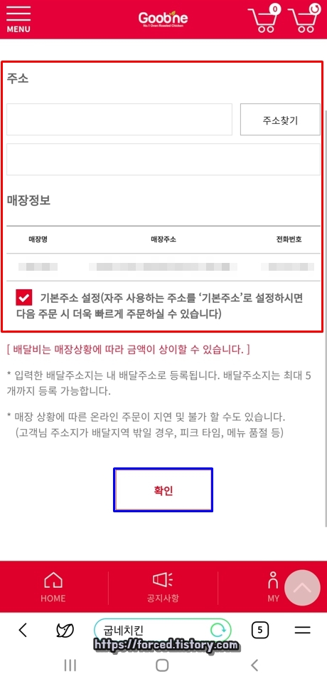 배달 주소 입력 및 매장 선택을 완료했다면, 아래에 보이는 '확인'을 눌러줍니다.