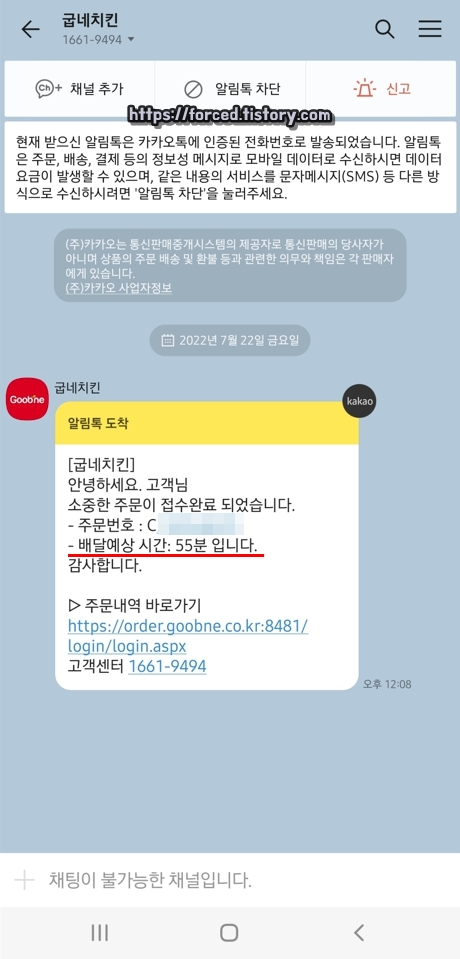 굽네치킨 기프티콘 주문 접수가 완료되면 이렇게 카카오톡으로 알림톡이 올 것입니다. 이 알림톡을 통해 배달 예상 시간을 확인할 수 있습니다.