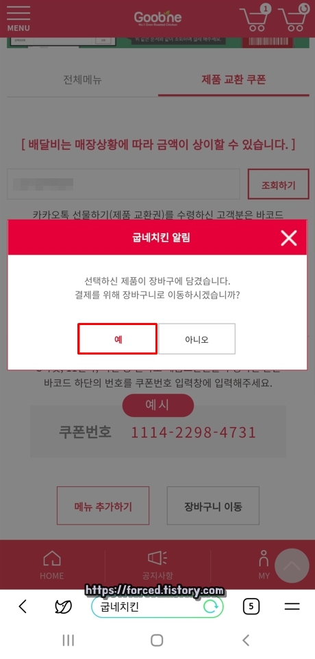 사용 가능한 기프티콘이 조회됐을 경우, 해당 상품이 자동으로 장바구니에 담길 것입니다. 위와 같은 알림이 떴다면 '예'를 눌러 장바구니로 이동해줍니다.