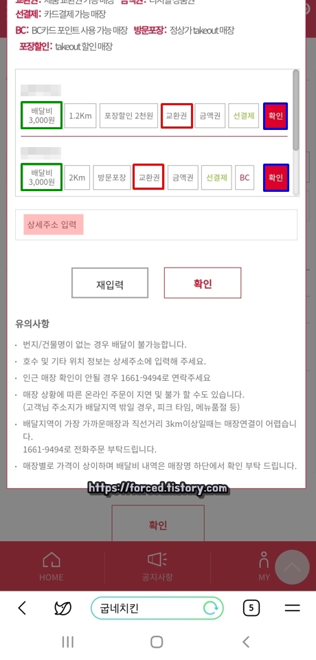 주소 검색을 완료하면 입력한 주소지로 배달 가능한 매장이 뜰 것입니다. 배달비와 교환권(기프티콘) 사용 가능 여부를 확인한 후, 우측에 보이는 '확인'을 눌러줍니다.