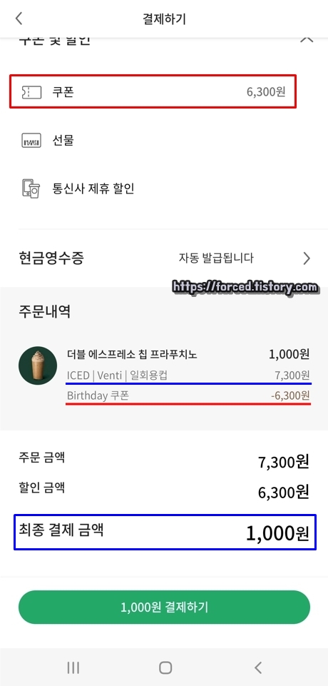 스타벅스 생일 쿠폰 사이렌 오더 사용은 결제 단계에서 '쿠폰 적용'을 통해 사용할 수 있습니다. 참고로 생일 쿠폰은 음료 사이즈 변경 시에도 사용 가능합니다. 물론 사이즈업 비용은 내야 하지만요. 스타벅스 음료를 벤티 사이즈로 먹으면 1,000원 추가니까 단돈 천 원만 내면 스타벅스에 있는 모든 음료를 벤티 사이즈로 먹을 수 있습니다.