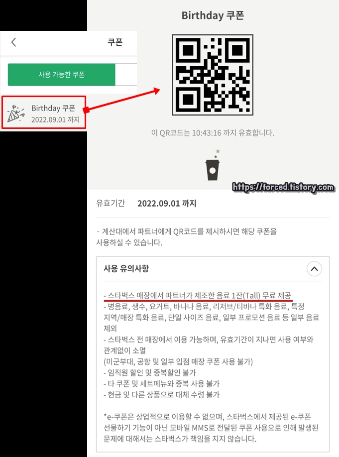만약 생일 쿠폰을 매장 안에서 직접 사용하고 싶다면, 사용 가능한 쿠폰에 있는 생일 쿠폰을 한 번 터치하면 나오는 QR 코드를 이용하면 됩니다. 참고로 스타벅스 QR 코드 유효시간은 10분입니다.