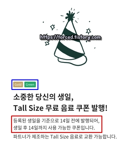 스타벅스 생일 쿠폰을 사용하면 스타벅스 톨(TALL) 사이즈 음료를 무료로 한 잔 먹을 수 있습니다. 어떤 음료든 상관없이 톨 사이즈라면 공짜로 한 잔을 먹을 수 있죠. 그러니까 생일 쿠폰을 사용할 때는 제일 비싼 음료를 먹는 것이 이득입니다.