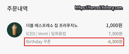 저는 스타벅스 생일 쿠폰과 차액 1천원으로 '더블 에스프레소 칩 프라푸치노 벤티 사이즈'를 먹었습니다. 단돈 1천원으로 이렇게 달달하고 맛있는 음료를 먹을 수 있다니 생일 쿠폰 정말 좋네요.!!