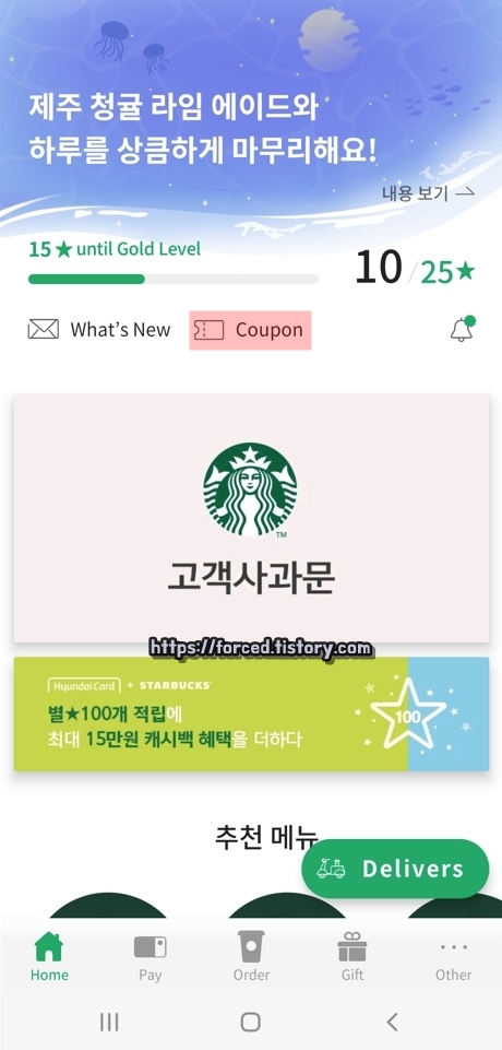 생일 쿠폰이 제대로 지급되었는지 확인해보기 위해 메인 화면에 보이는 'Coupon(쿠폰)'을 눌러줍니다.
