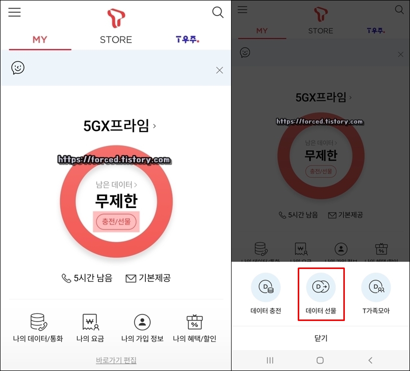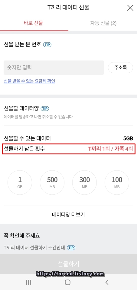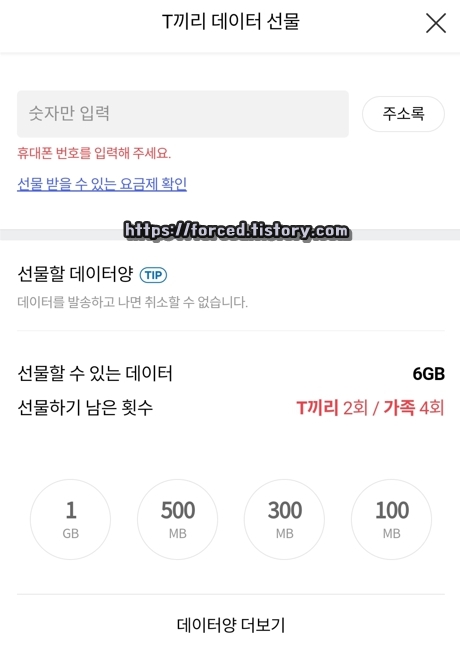 ※ 데이터 선물 후 기본 잔여 데이터가 500MB 이상인 경우에만 선물이 가능합니다.