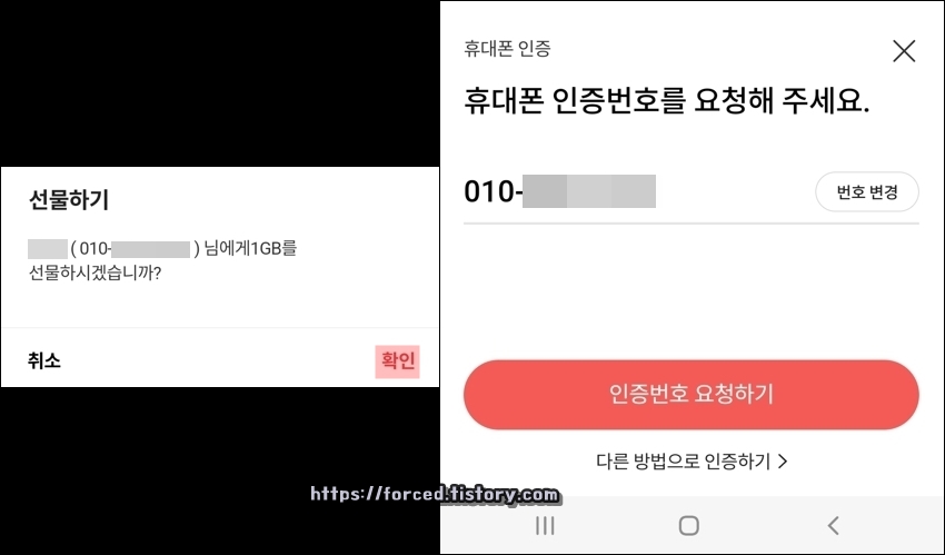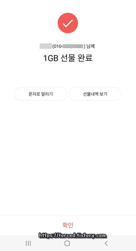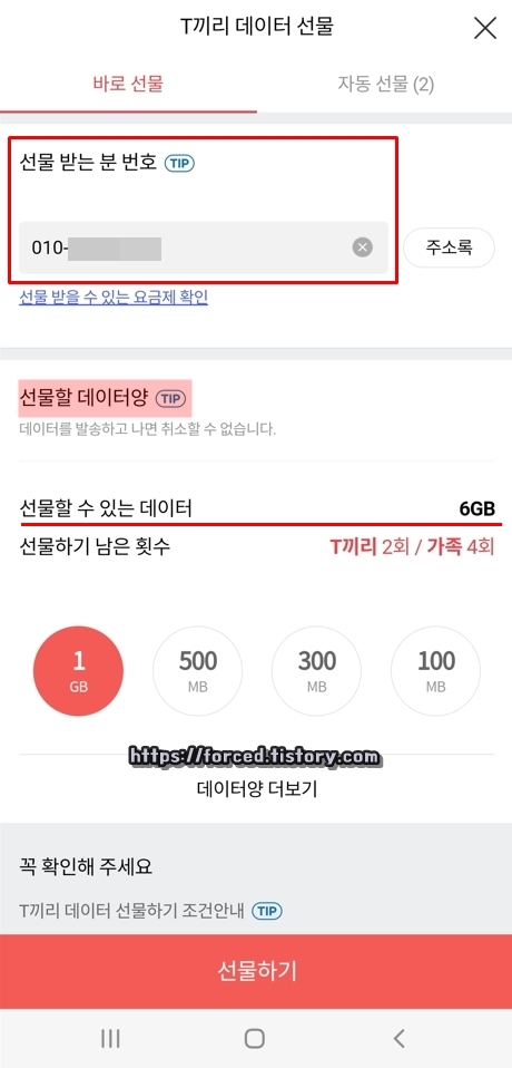 선물 받는 분 번호와 선물할 데이터양을 입력한 후, 아래에 보이는 선물하기 버튼을 눌러줍니다.