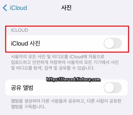 여기서 iCloud 사진을 ON으로 바꿔주면 됩니다. 이후, 사진이나 동영상을 원본 용량 그대로 고화질 상태로 저장할 것인지 용량을 약간 줄여 최적화한 후 저장할 것인지 선택하게 됩니다.