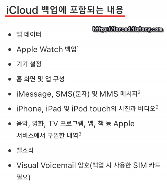 아이클라우드(iCloud)에 백업되는 내용은 앱 데이터, 애플워치 데이터, 기기 설정, 홈 화면 및 앱 구성, 아이메세지, 문자, 아이폰과 태블릿에 저장된 사진이나 비디오, 음악과 영화 등 애플 서비스에서 구입한 내역, 벨소리, Visual Voicemail 암호입니다.