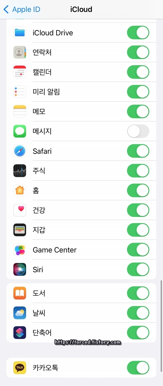 그리고 만약 기본 설치 앱 중 데이터 백업을 원하지 않는 앱이 있다면, iCloud 메뉴에서 해당 앱을 OFF 상태로 바꿔줍니다.