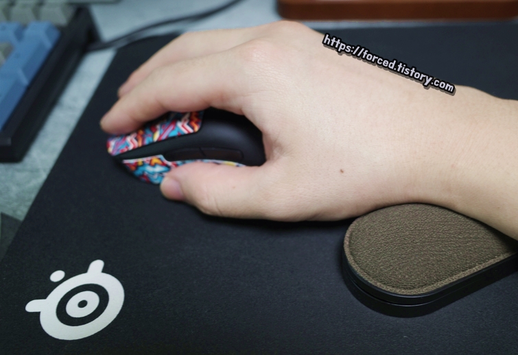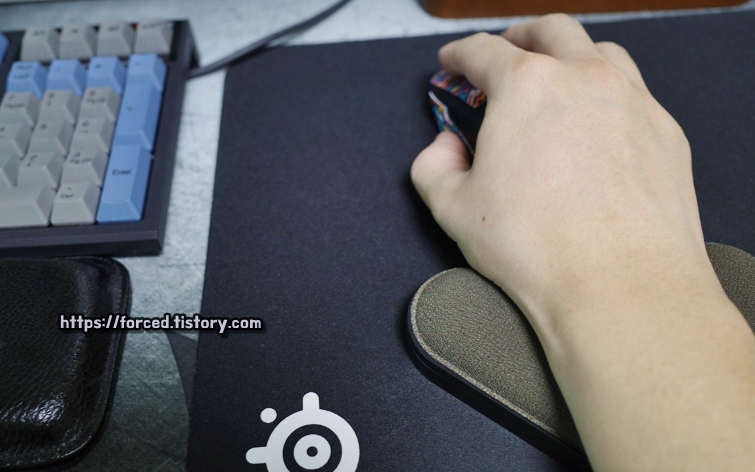 손목 받침대에 손목을 올리고, 마우스를 잡으면 대충 이런 모습입니다. 손목 받침대를 사용하니 손목이 위로 꺾이지 않고, 마우스의 높이와 손목 받침대의 높이가 거의 일직선으로 비슷하죠? 바로 이런 식으로 사용해야지만 손목터널 증후군을 예방할 수 있습니다.