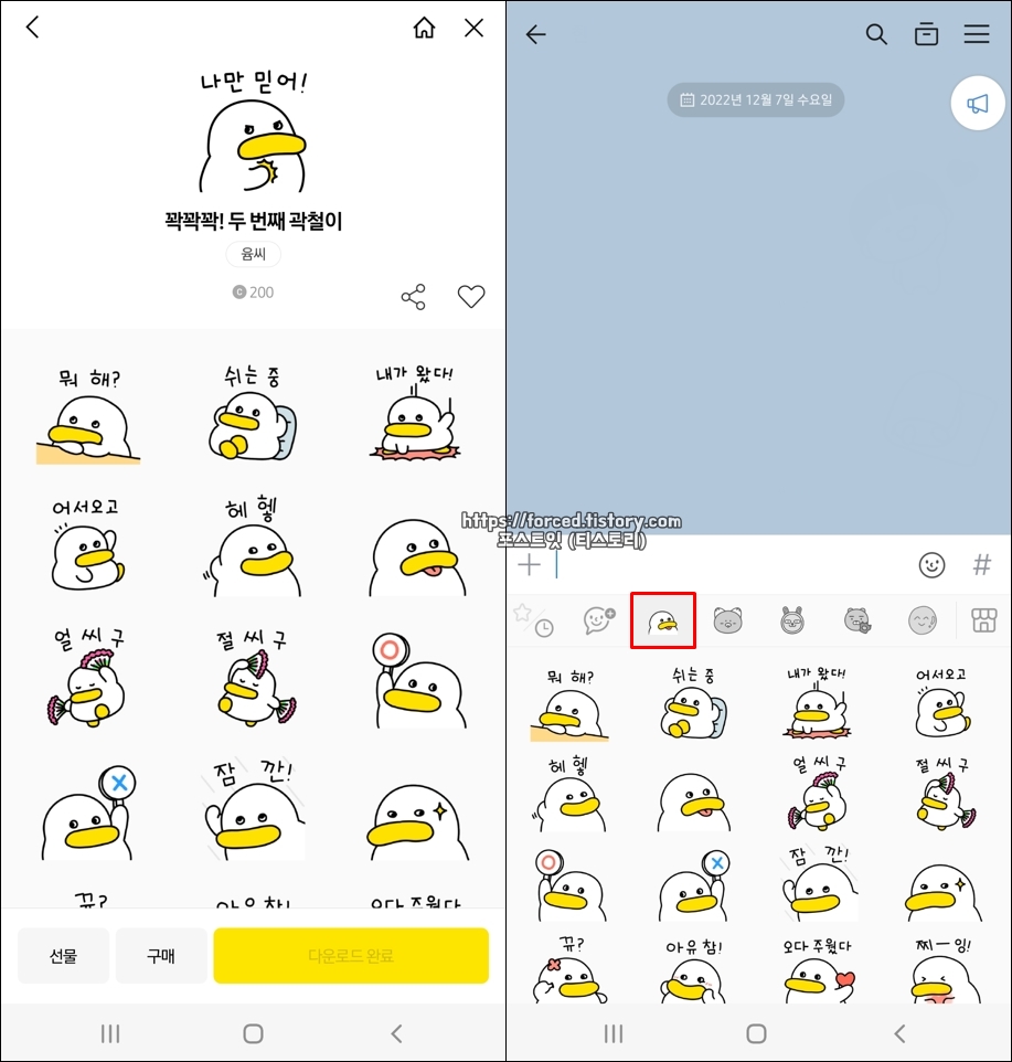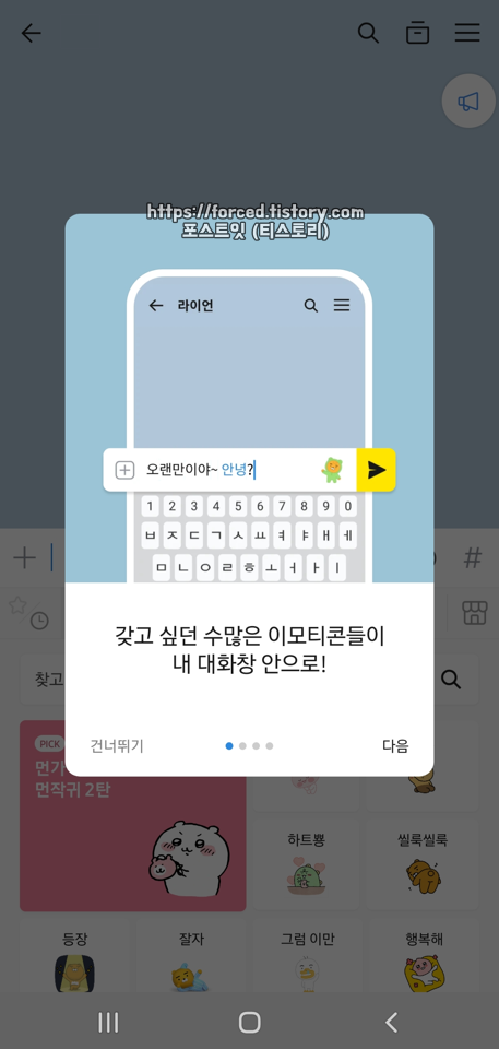 다운로드를 완료하면 이렇게 이모티콘 메뉴에 즉시 추가되며, 이모티콘 플러스를 사용하는 동안은 계속해서 무료로 사용할 수 있습니다.
