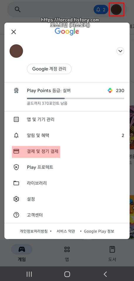 먼저 구글 플레이 스토어를 실행한 후, 우측 상단에 보이는 본인 프로필을 눌러줍니다. 그리고 이어서 "결제 및 정기 결제"를 눌러줍니다.