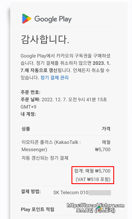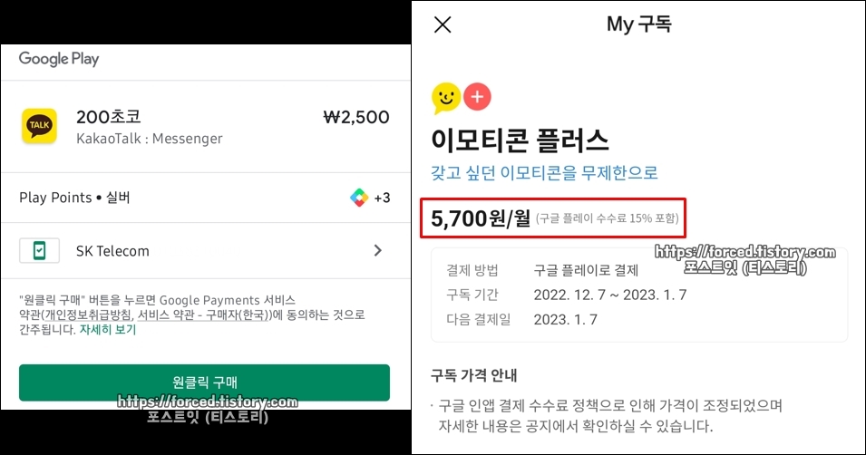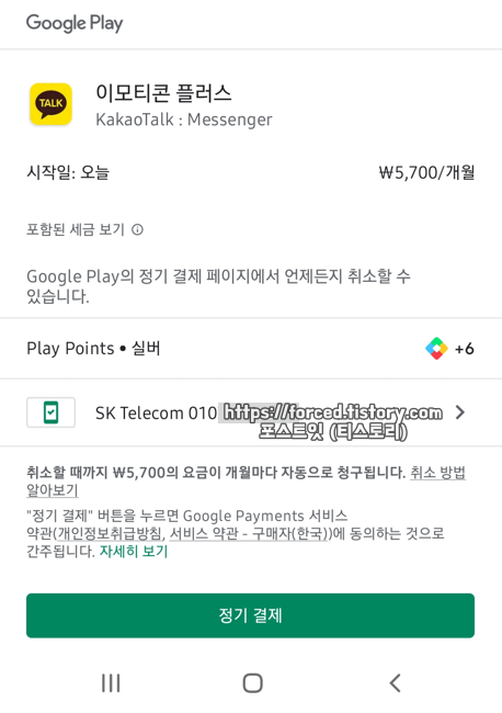 참고로 카카오톡 이모티콘 플러스 결제 금액인 5,700원에는 구글 플레이 수수료뿐만 아니라 부가세(VAT)도 포함되어있습니다. (5,700원 외 추가 결제 금액 없음)
