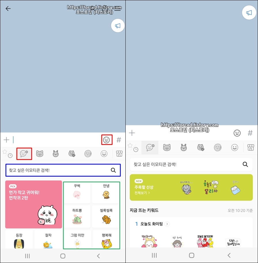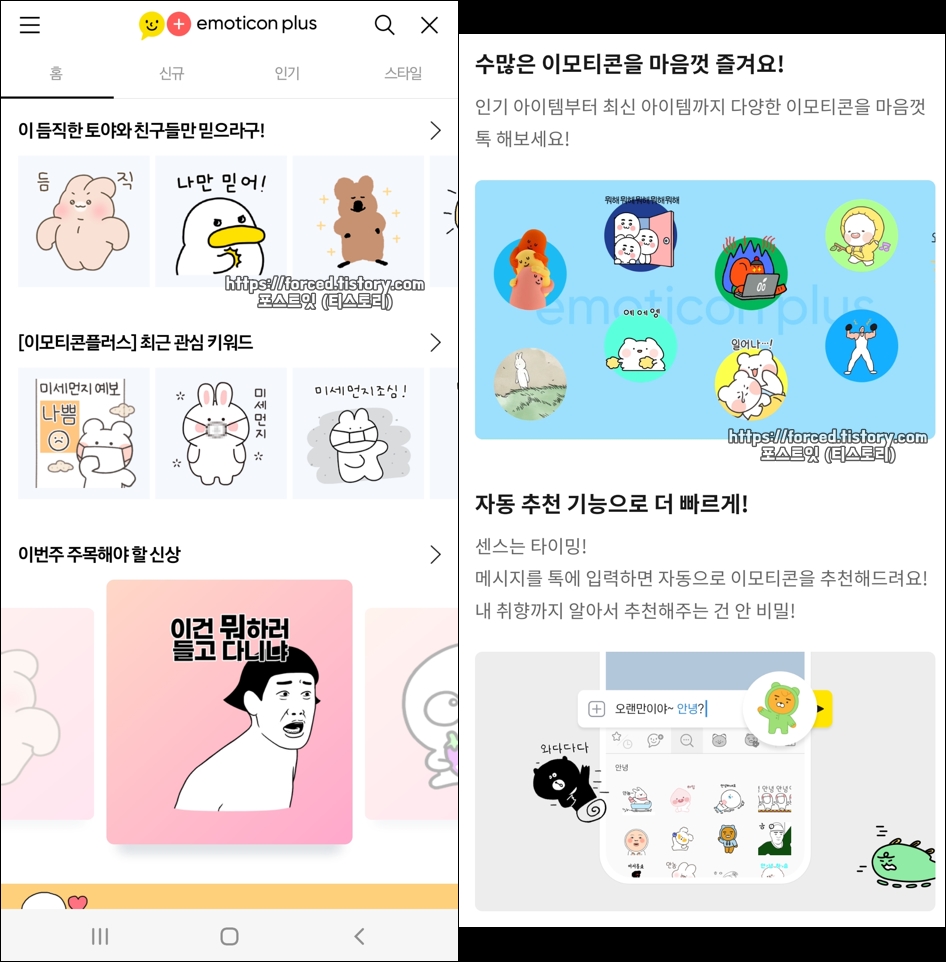 이모티콘을 여러 개 다운로드하면 이모티콘 사용 시 메뉴들이 많아지니 좀 복잡해집니다. 그렇기 때문에 보통은 이모티콘 플러스 가입 후 카카오톡 채팅방에서 키워드 추천을 통해 마음에 드는 이모티콘을 사용합니다.