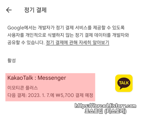정기 결제 목록에 보이는 "KakaoTalk : Messenger 이모티콘 플러스"를 눌러줍니다.