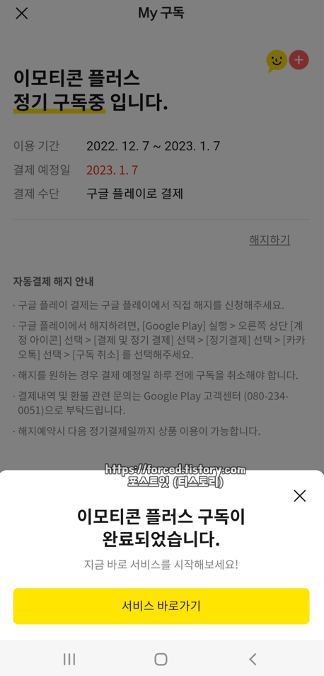 이모티콘 플러스를 해지하고 싶다면, 구글 플레이 스토어에서 처리할 수 있습니다. 그리고 이모티콘 플러스 해지를 하더라도 현재 이용 중인 기간까지는 계속해서 이용할 수 있습니다. (다음 결제 예정일 전까지)
