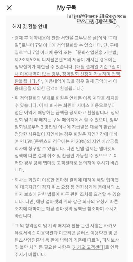 이모티콘 플러스 결제 취소 및 환불을 원한다면, 결제일 기준으로 7일 이내에 이용 내역이 없어야지만 전액 환불을 받을 수 있습니다. (청약 철회)