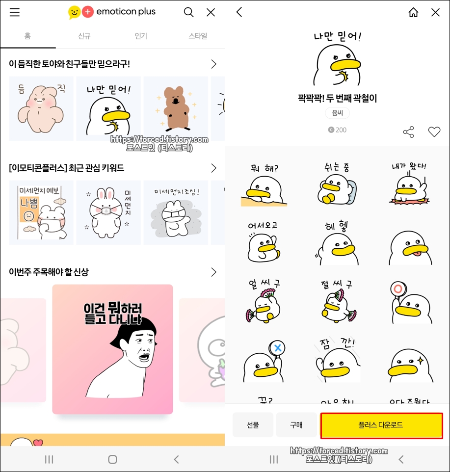 마지막으로 카카오톡 이모티콘 샵에서 마음에 드는 이모티콘을 다운로드해서 사용하는 방법입니다. 카카오톡 이모티콘 샵에서 마음에 드는 이모티콘을 찾은 후, 아래에 보이는 "플러스 다운로드"를 누르면 무료로 다운로드해 사용할 수 있습니다.