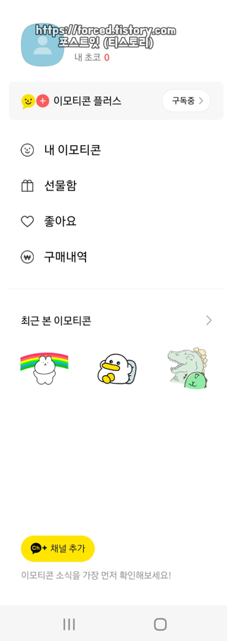 이모티콘 플러스 구독을 완료하면 이렇게 "이모티콘 플러스 (구독중)"이라고 표시됩니다.