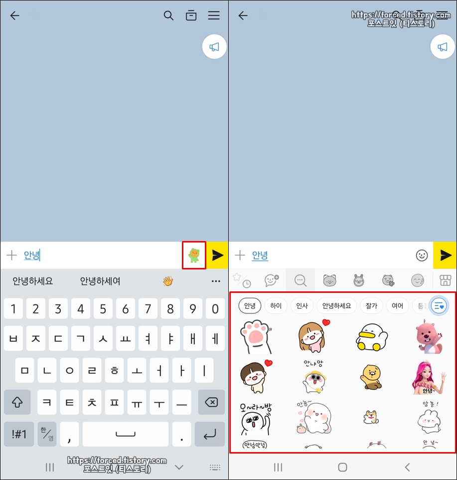 다음으로 내가 채팅방에 입력한 키워드를 통해 이모티콘을 자동 추천받는 방법입니다. 위 사진과 같이 "안녕"이라는 문구를 입력하면 우측에 이모티콘 표시가 뜨는데요. 그것을 터치하면 관련 이모티콘들을 추천받을 수 있습니다. 여기서 마음에 드는 이모티콘을 터치하면 바로 사용할 수 있죠.