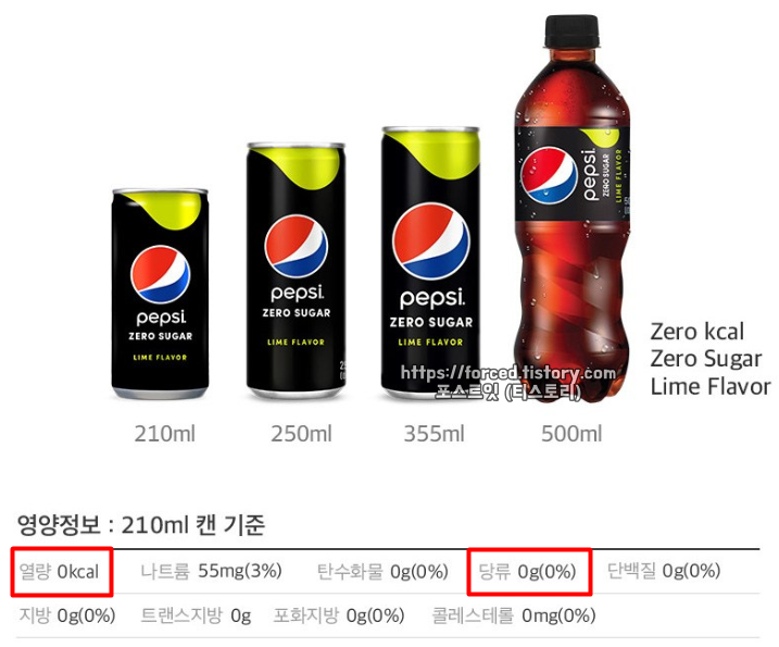 참고로 제로 탄산음료의 1인자라고 불리는 펩시 제로는 당류 0%에 0칼로리입니다. 이것은 완전 제로 칼로리 탄산음료죠.