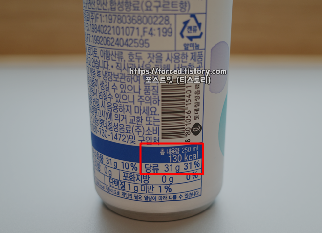 캔 250ml 기준 각각의 칼로리는 8 Kcal, 130 Kcal입니다. 칼로리 차이는 서로 약 16배 정도 차이가 나네요.