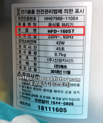 그런데 탈수통이 있는 것은 아무거나 사서 교체 못하더라고요. 싱크대 아래를 보면 이렇게 음식물 처리기의 모델명이 적혀있는데요. 이 모델이랑 호환이 되는 탈수통이나 덮개를 사야하더라고요. 인터넷에서 아무거나 사서 쓰면 안 되더라고요. 제가 사용하고 있는 것은 보니까 하츠라는 회사에서 판매하고 있는 " HFD-160ST "라는 제품이네요. 이것을 가지고 호환되는 탈수통을 찾으면 됩니다.
