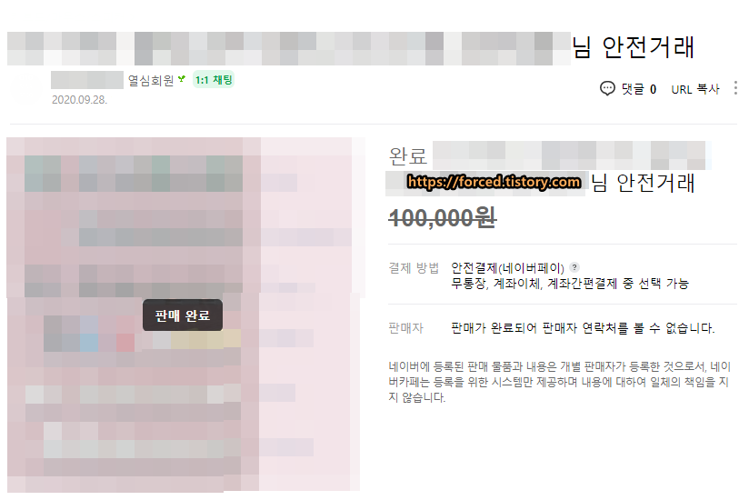 안전거래 주문 이후 판매글도 한 번 확인해봤습니다. 이렇게 '판매 완료'로 표시되는군요.