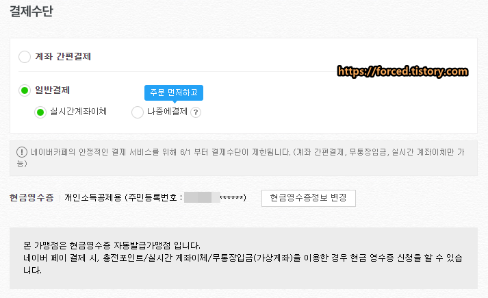 저는 실시간 계좌이체 결제로 진행했습니다. 참고로 안전거래 수수료는 무통장 입금이 제일 적습니다. '나중에결제'에 무통장 입금이 있다는 것을 나중에 알게 되어서 안전거래 수수료 절약은 못했네요.. (판매자님 죄송합니다.)