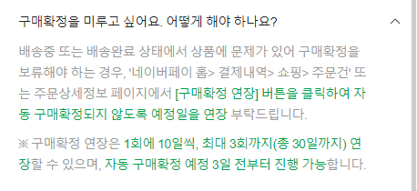 상품에 문제가 있어 구매 확정을 미루고 싶다면, 네이버페이 주문 내역에서 구매확정 연장 버튼을 누르면 됩니다. 구매 확정 연장은 1회에 10일씩, 최대 3회까지(총 30일까지) 연장할 수 있습니다.