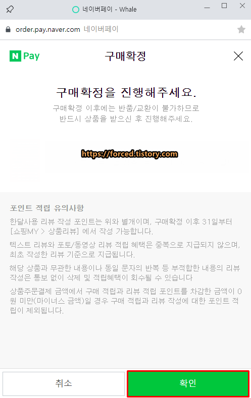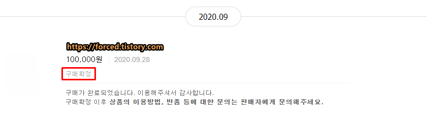 그러면 이렇게 '구매확정이 완료되었습니다'라는 확인 창이 뜰 것입니다.
