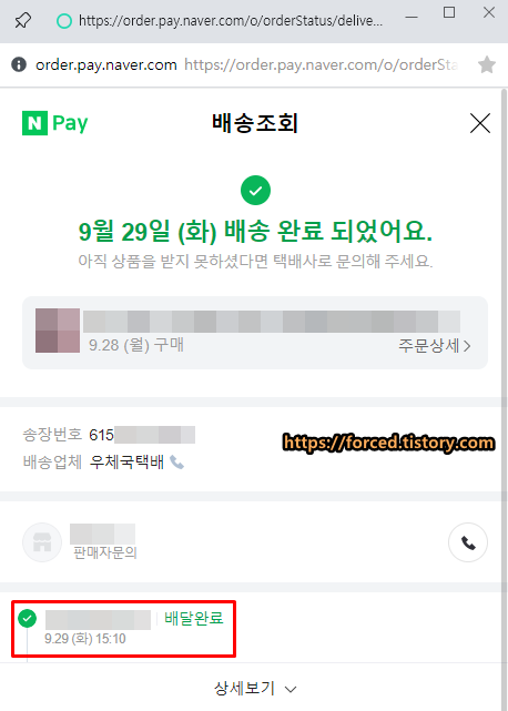배송 정보를 자세히 확인할 수 있습니다. 택배 배송 상태는 '배달완료'라고 나오네요.