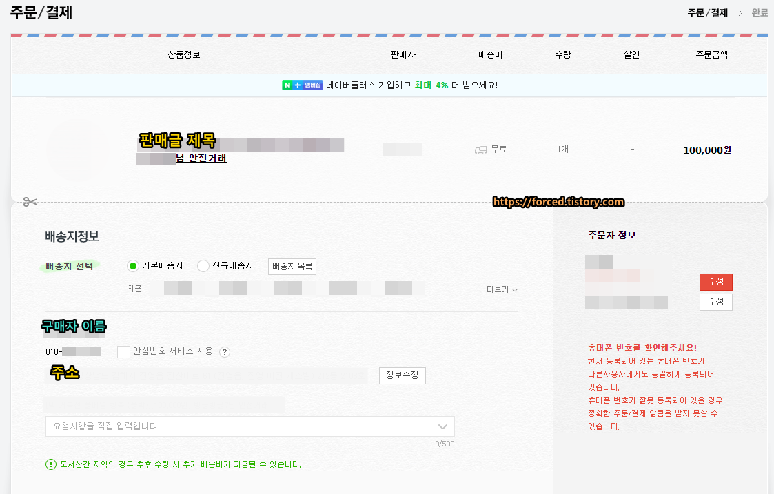 그러면 주문 및 결제 창이 뜰 것인데요. 여기서 일단 배송지를 입력해줍니다.