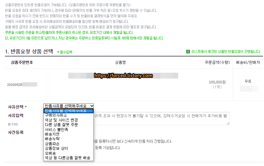 반품 사유를 선택하고, 반품 사유를 입력해줍니다. 선택 가능한 반품 사유는 구매의사 취소, 색상 및 사이즈 변경 등입니다. 사진 등록도 가능합니다.