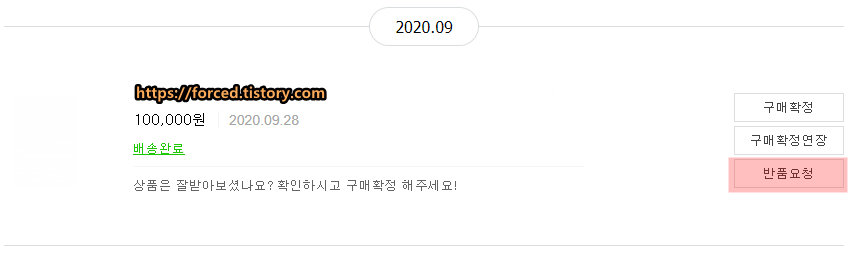 여기서 확인 버튼을 눌러줍니다. 참고로 구매 확정 이후에는 반품 또는 교환이 불가능합니다.