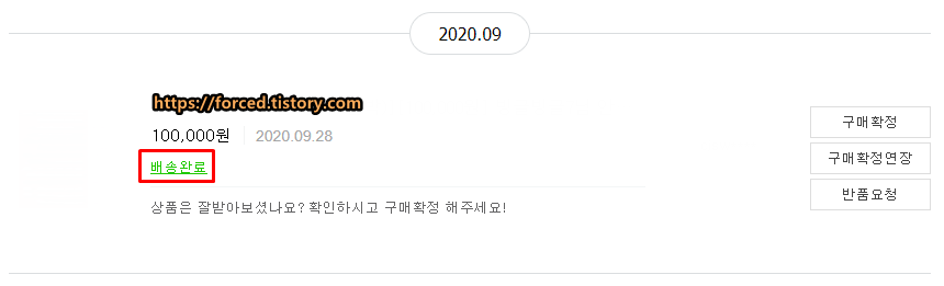 배송이 완료되면 이렇게 '배송완료'라고 표시됩니다. 배송완료 부분을 한 번 클릭해볼까요?